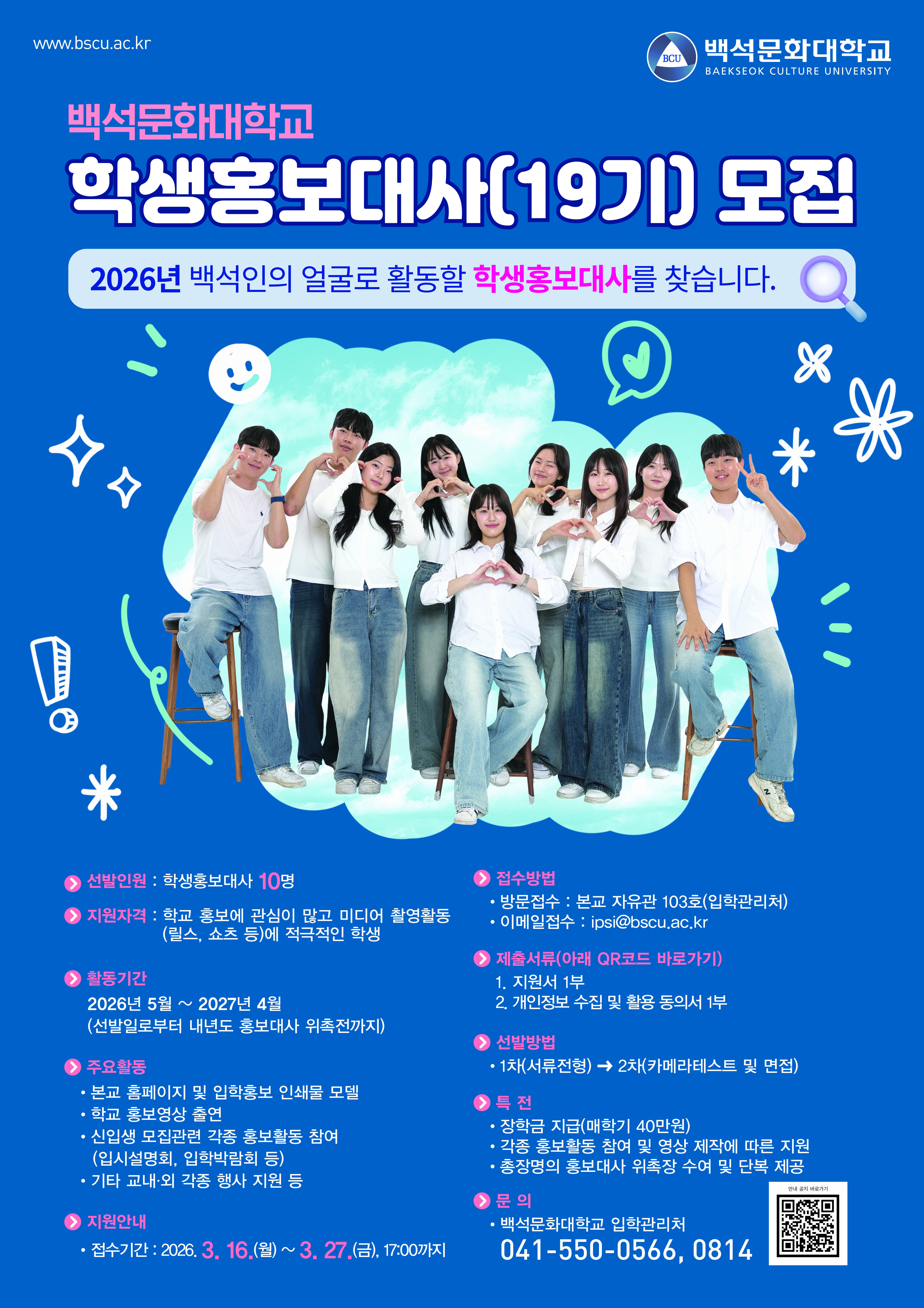 2026년 백석인의 얼굴로 활동한 끼와 열정이 넘치는 백석문화대학교 학생홍보대사를 모집합니다.